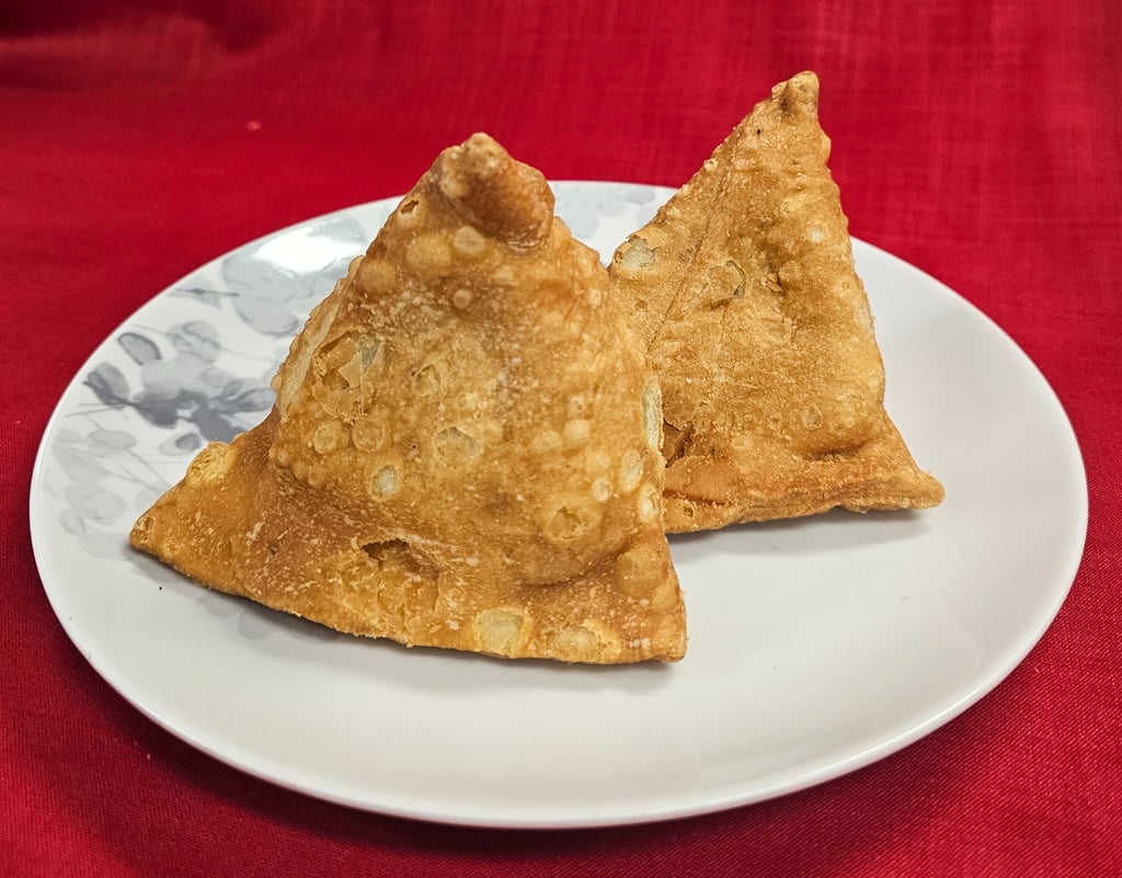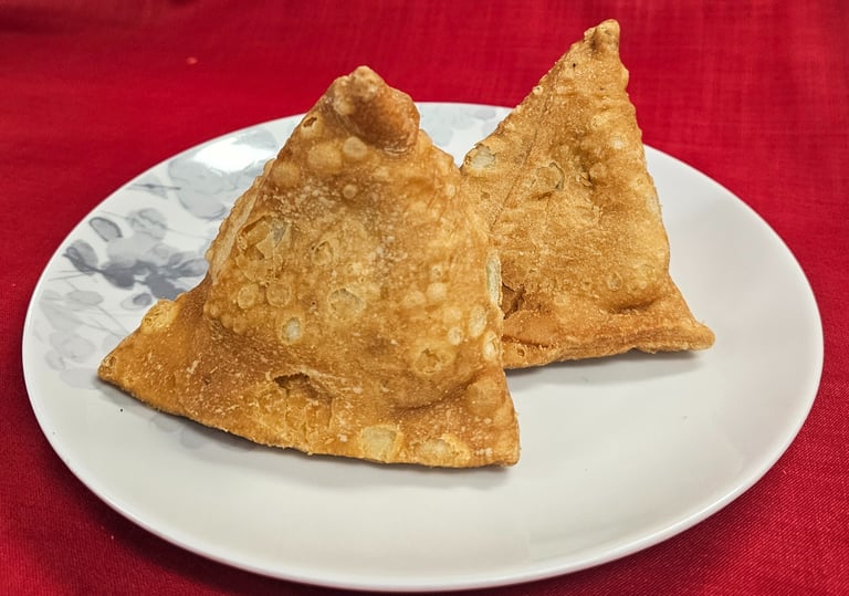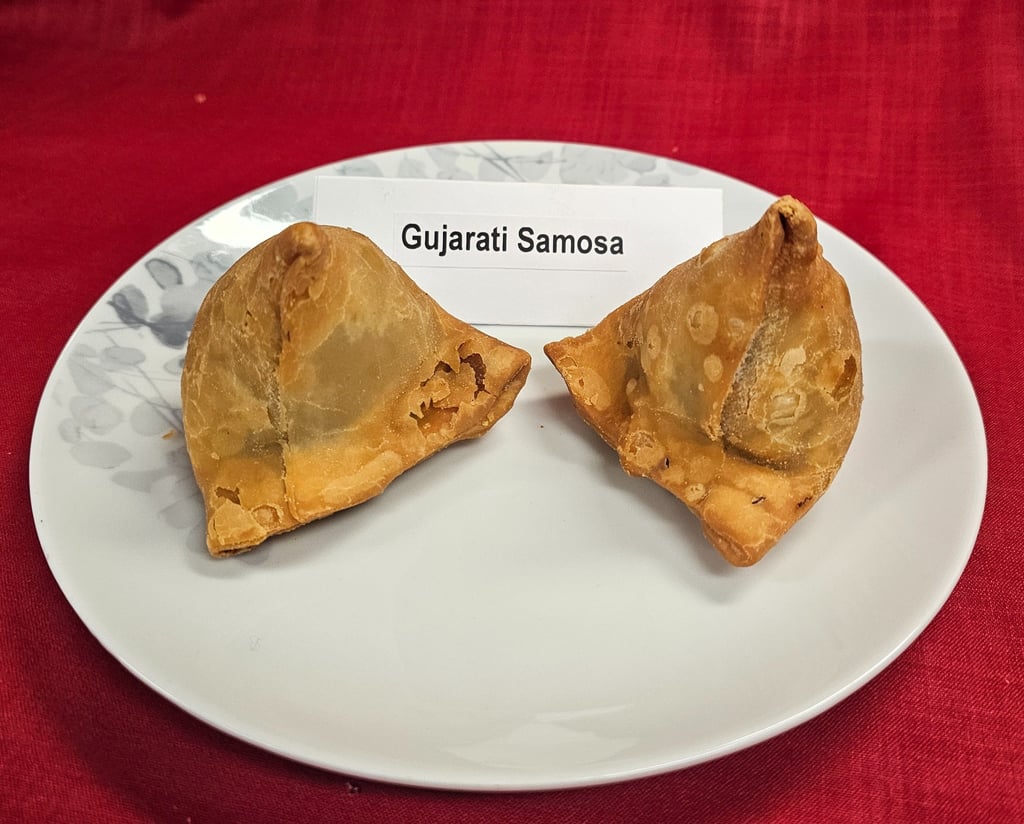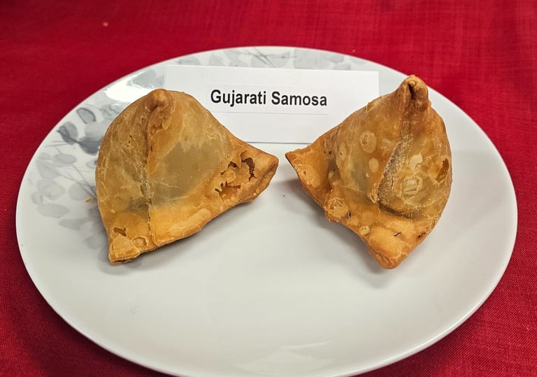 Gujarati samosas are freshly made with a light crispy shell and a spicy filling full of traditional flavor.