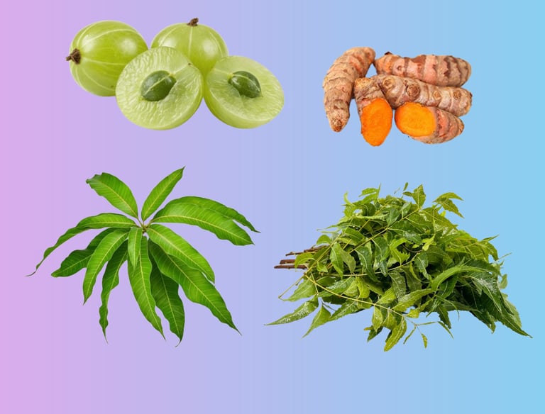 Fresh amla, turmeric roots, mango leaves, and neem leaves bring the purity of nature with traditional wellness and cultural value to your home and daily rituals.